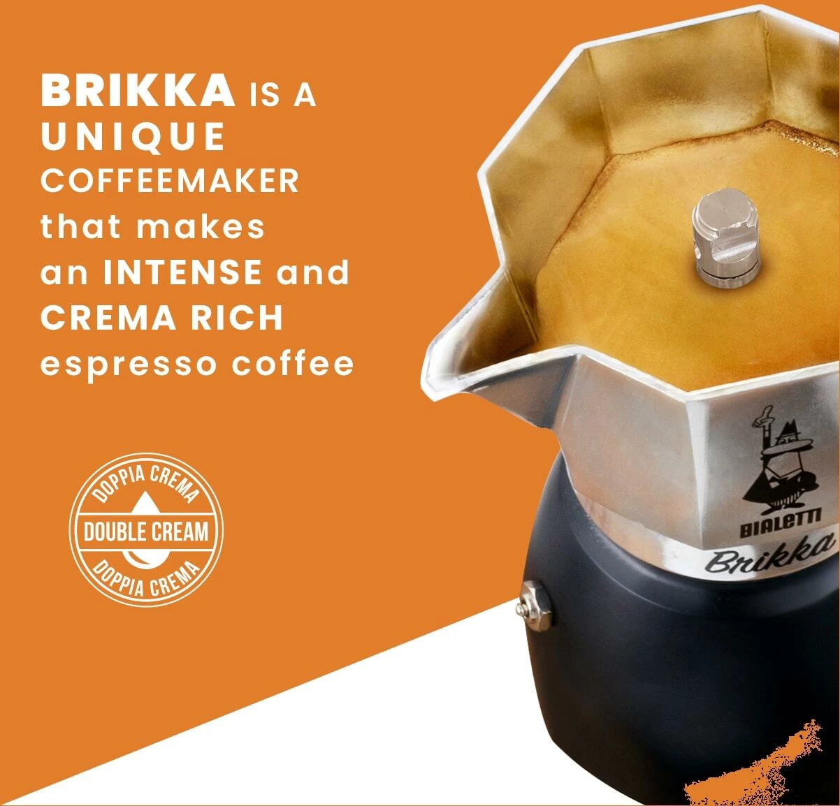 Für die Zubereitung eines starken und cremigen Espressos wie aus der Bar, gibt es heute Brikka: Es ist die einzige Espressokanne, mit der sich Espressotassen mit 30 ml Inhalt bei einer fast doppelt so hohen Espressokonzentration, wie bei einer herkömmlichen Espressokanne und mit einem köstlichen Cremehäubchen darauf zubereiten lassen. Das Geheimnis von Brikka ist ein exklusives Ventil am kleinen Rohr: ein einziges, patentiertes System, mit dem der Espresso mit einem doppelt so hohen Druck wie bei der herkömmlichen Espressokanne und in der Hälfte der Zeit gebrüht wird.