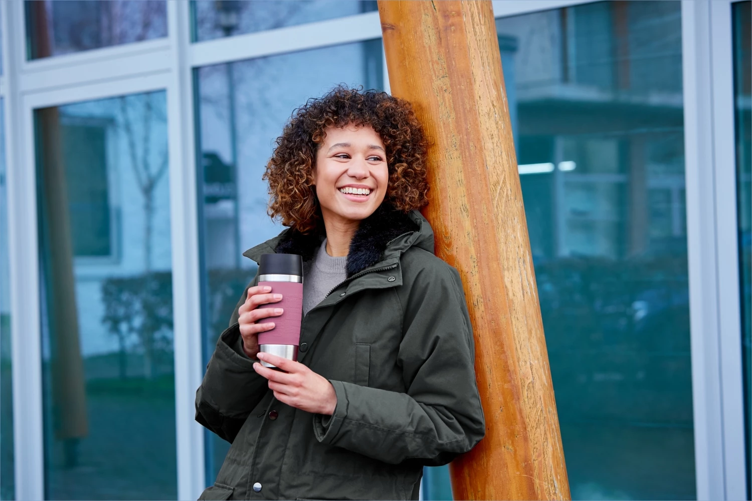 Der Isolierbecher Travel Mug von Emsa ist Testsieger unter den Thermobechern und vereint Funktionalität und modernes Design: Der Edelstahlkörper ist vakuumisoliert und die Soft-Touch-Manschette mit trendiger Kaffee-Prägung sowie der rutschfeste Boden sorgen für einen sicheren Halt des Trinkbechers. Warme Getränke bleiben bis zu 4 Stunden heiß und kühle Getränke bis zu 8 Stunden kalt. Für eine optimale Reinigung kann der Travel Mug-Deckel in zwei Teile zerlegt werden.