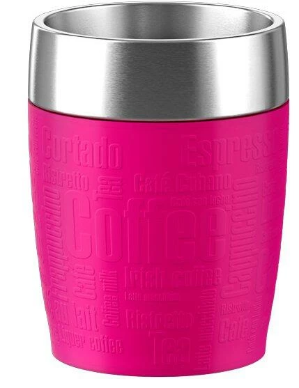 Emsa Isolier-Trinkbecher Travel Cup in himbeer. Der Isolierbecher mit der attraktiven Silikonummantelung und der trendigen Kaffeeprägung.