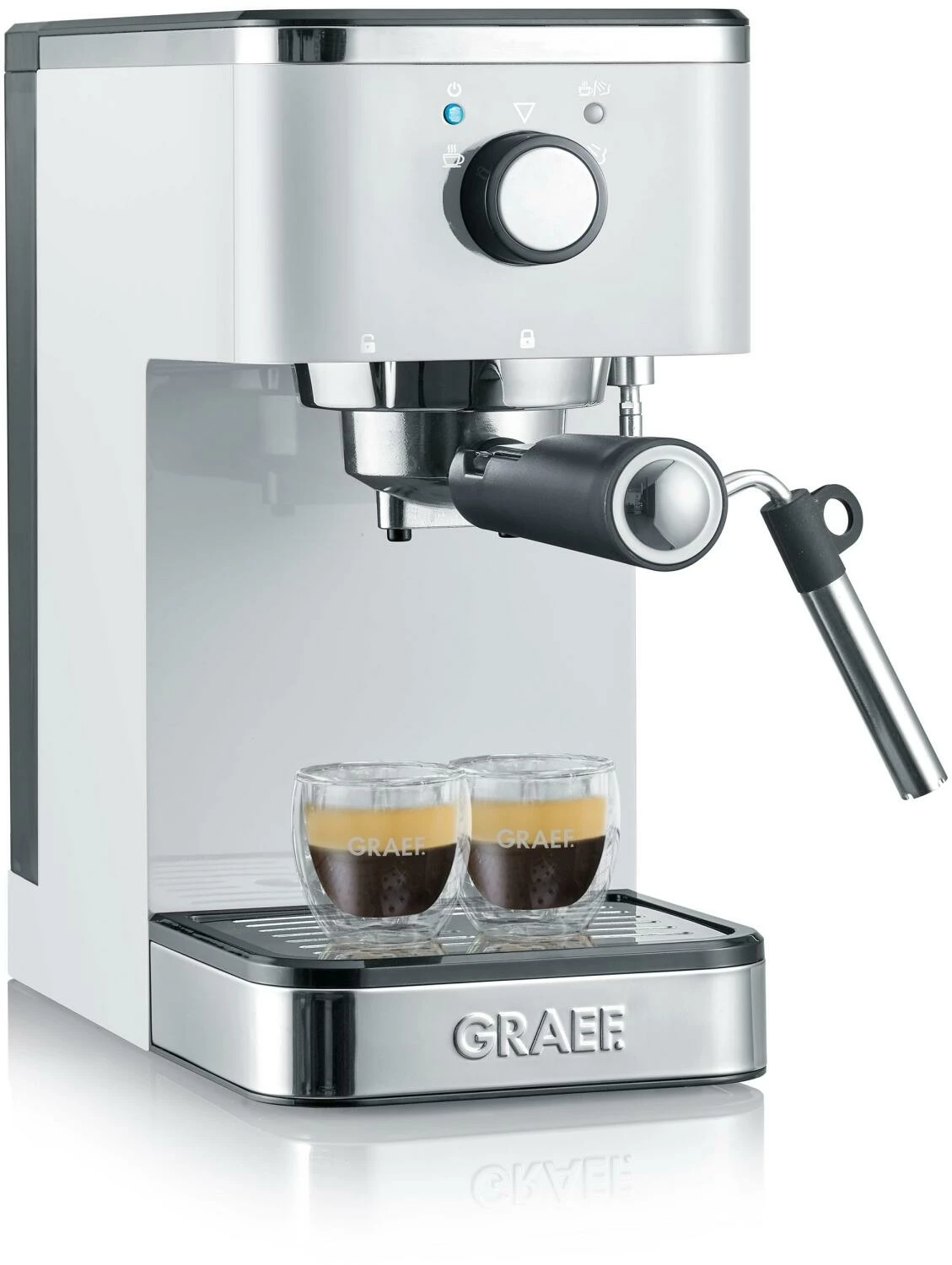 GRAEF Siebträger-Espressomaschine salita, weiß. Mit Einkreis-Thermoblock – heizt extraschnell auf. Durch das Vorbrühsystem wird das Kaffeemehl vor dem Bezug befeuchtet und wird noch aromatischer. Der Pannarello Aufsatz verhilft Einsteigern zu cremigem Milchschaum.