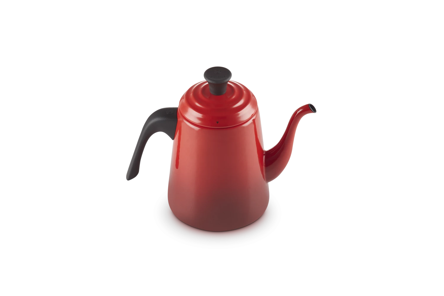 Le Creuset Wasserkessel Drip in kirschrot. Der Wasserkessel mit schmalem, geschwungenem Hals ist aus emailliertem Karbonstahl und farblich auf das
