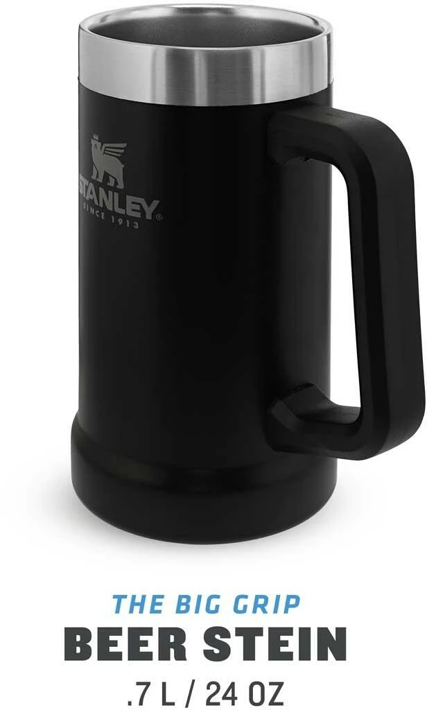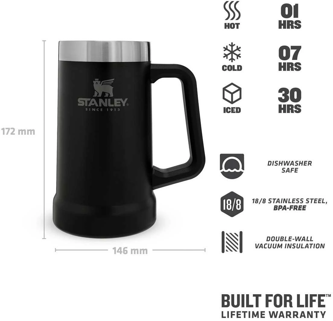 Dieses Produkt ist ein Muss für Bierliebhaber: Der mattschwarze Stanley ADVENTURE VACUUM STEIN – der vakuumisolierte Edelstahl-Bierkrug! Als cooles Oktoberfest-Accessoire, als Geschenk für private Oktoberfestfeiern oder einfach nur für den täglichen Biergenuss ist der ADVENTURE VACUUM STEIN perfekt geeignet. Dabei verfügt der aus 18/8-Edelstahl gefertigte Bierkrug dank des Vakuums über eine Kühlleistung von bis zu 7 Stunden. Das Produkt ist frei von BPA und außerdem spülmaschinenfest. Letzteres hat einen tollen Nebeneffekt: Der ADVENTURE VACUUM STEIN ist ideal für den Wechsel zwischen Kalt- und Heißgetränken geeignet, kann also auch zur XXL-Tasse für Tee und Kaffee genommen werden. Mit seinen 709 ml Fassungsvermögen (24oz. – Amerika lässt grüßen!) lässt er sich auch hervorragend ohne zu viel Vorsicht mit den handelsüblichen 500 ml-Flaschen befüllen, Schaumkrone inbegriffen.
