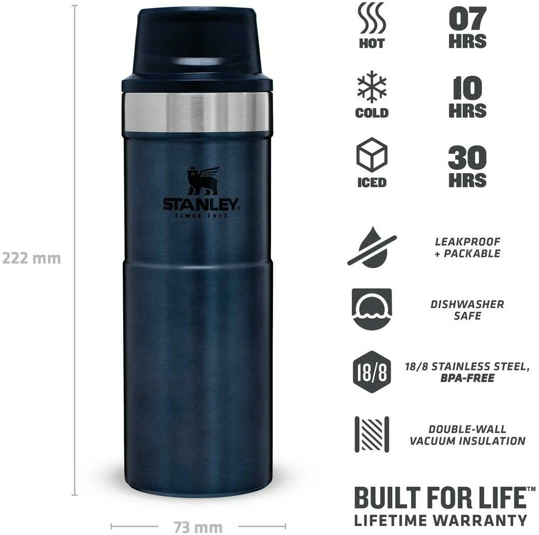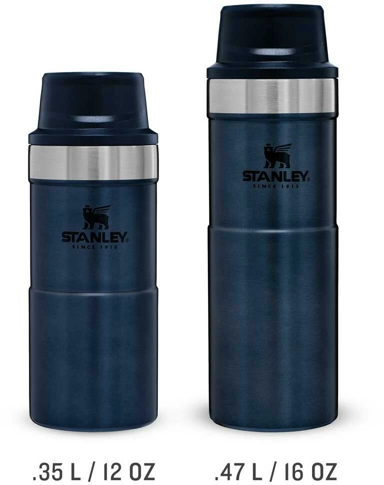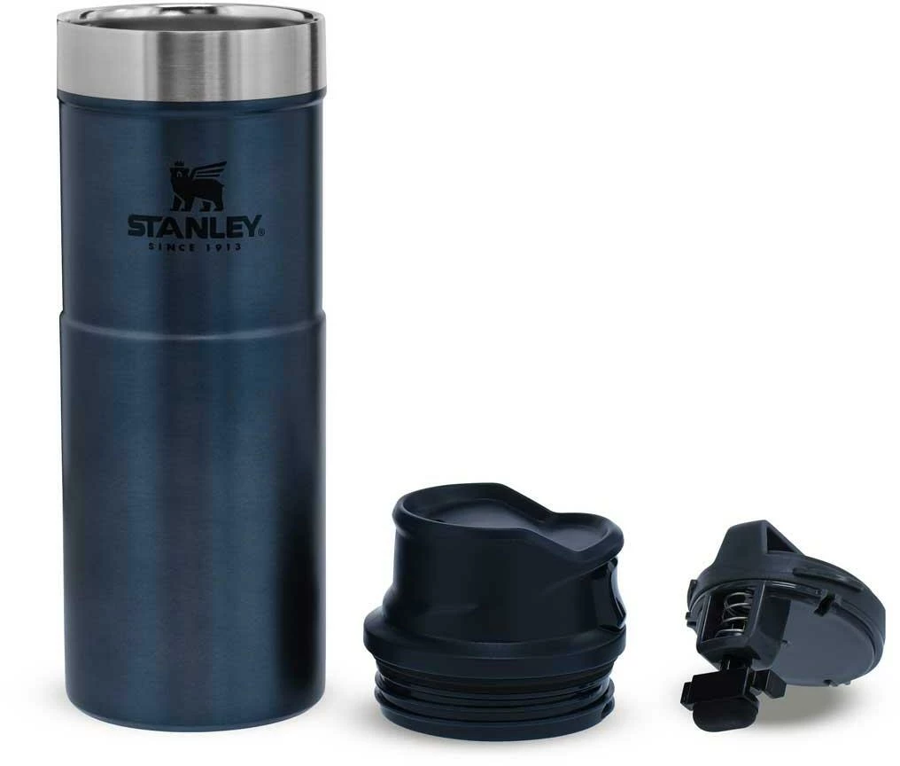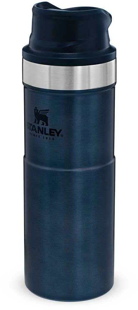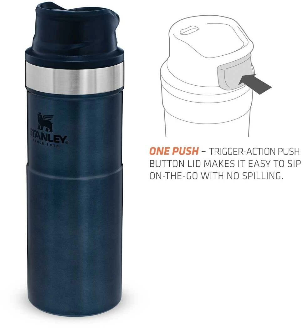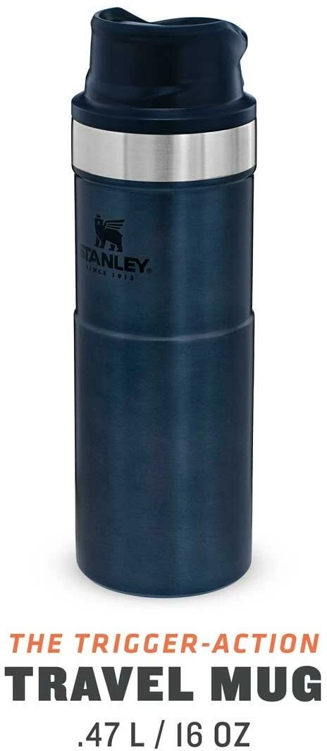 Mit dem Stanley CLASSIC TRIGGER-ACTION TRAVEL MUG in Nightfall Blue führt Stanley eine neue Generation der Becher mit Einhandbedienung ein. Das Drücken der großen und sehr leichtgängigen Taste zum Aktivieren der Trinköffnung mit einer Hand macht Trinken – on the go – zum Vergnügen. Der Trinkbecher aus rostfreiem 18/8-Edelstahl mit Vakuumisolierung besitzt ein Fassungsvermögen von 473 ml und hält Getränke bis zu 7 Stunden heiß oder sogar 10 Stunden gekühlt. Der TRIGGER-ACTION TRAVEL MUG ist komplett spülmaschinenfest, auslaufsicher und passt in gängige PKW-Getränkehalterungen. BPA-frei.