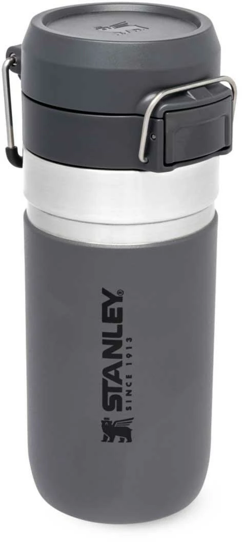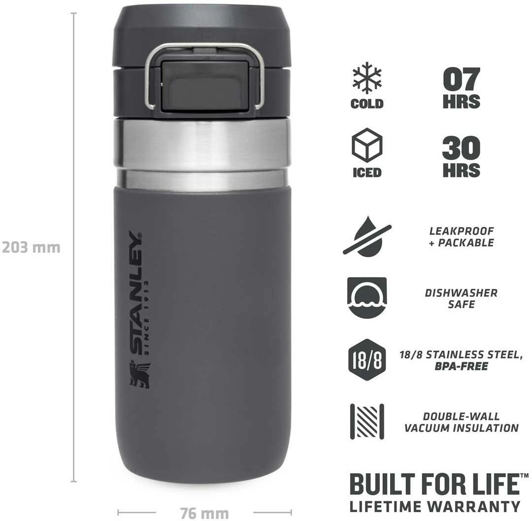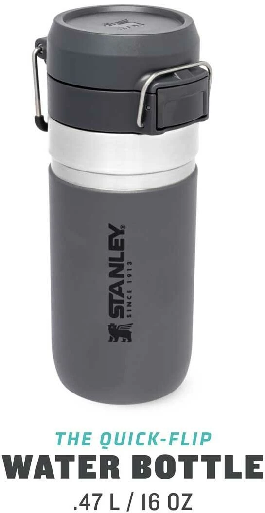 Ob für die Outdoor-Tour, den Sport oder einfach On The Road, die Stanley QUICK-FLIP WATER BOTTLE ist der ideale Begleiter gegen den Durst. Die auslaufsichere Flasche ist mit einem innovativen, zweistufigen Sicherheitsverschluss ausgestattet. Beim Transport wird der Verschluss gegen unbeabsichtigtes Öffnen von einem Edelstahlbügel fixiert. Wird dieser gelöst und der Push-Button Knopf gedrückt, flippt der Deckel federunterstützt auf. Die Trinkflasche aus rostfreiem 18/8-Edelstahl mit Vakuumisolierung besitzt ein Fassungsvermögen von 473 ml und hält Getränke bis zu 5 Stunden heiß oder 7 Stunden gekühlt. Die Flasche passt in gängige PKW-Getränkehalter und ist mit einem beweglichen Bügel zum Anhängen an den Rucksack oder Tragegriff ausgestattet. Alle Teile können in der Spülmaschine gereinigt werden. BPA-frei.