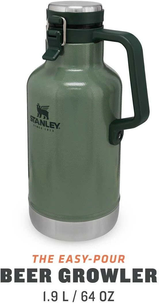 Der aus rostfreiem 18/8 Edelstahl gefertigte Stanley CLASSIC VACUUM BEER GROWLER ist mit einer schützenden, grünen Hammerschlaglackierung versehen. Die doppelwandige Vakuum-Isolation hält Getränke bis zu 18 Stunden heiß oder 24 Stunden kalt. Der seitlich montierte Kunststofftragegriff sorgt für den problemlosen Transport der Flasche. Der robuste Deckelverschluss hält auch kohlensäurehaltigen Getränken sicher Stand. Durch die 6 cm weite Öffnung lässt sich die Flasche sehr gut befüllen und reinigen. Alle Teile sind spülmaschinenfest und natürlich BPA frei. Fassungsvermögen 1,9 Liter.