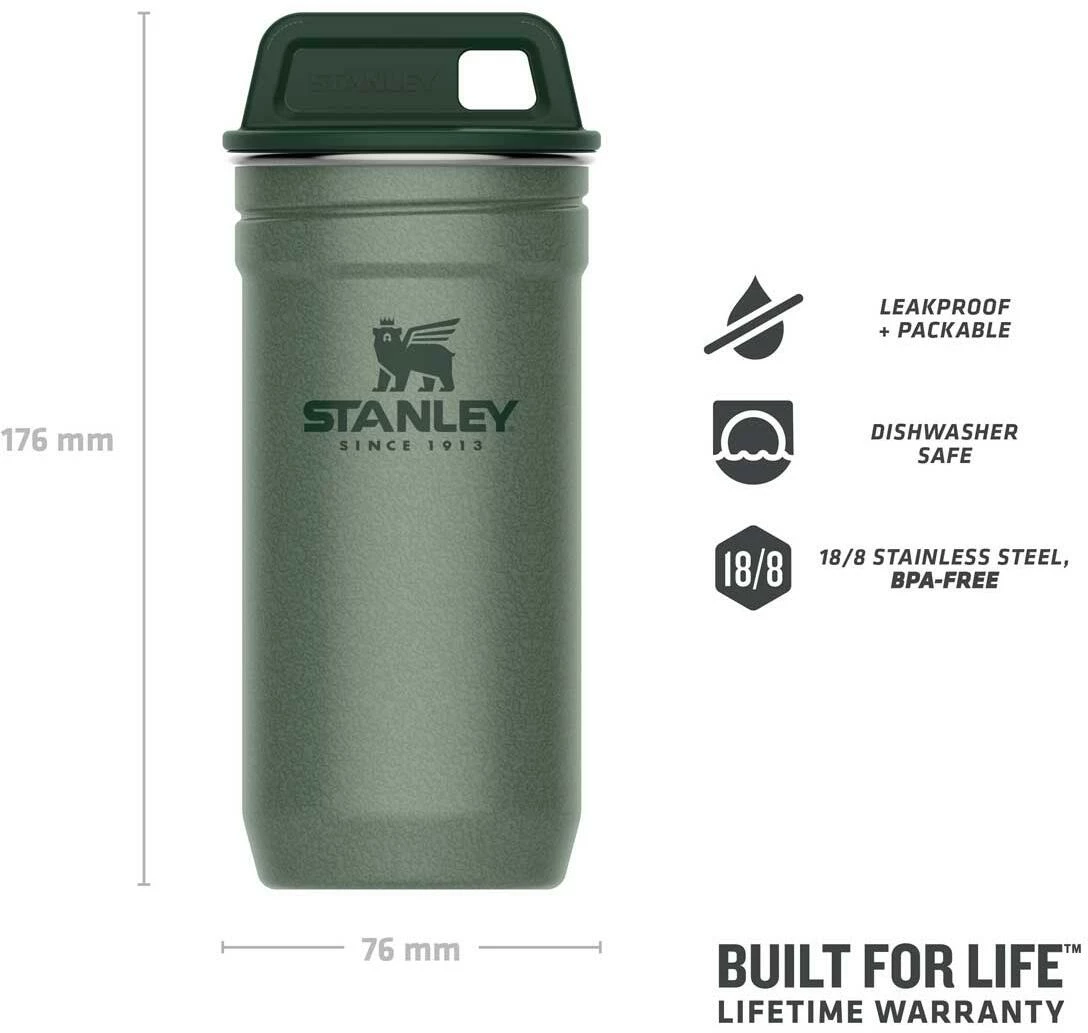 Das Stanley ADVENTURE SHOT GLASS SET besteht aus 4 Edelstahl-Bechern (shot glasses) mit einem Fassungsvermögen von je 59 ml aus rostfreiem 18/8 Edelstahl, die in einem formschönen Edelstahlbehälter in Hammerschlag-grün mit Schraubverschluss verpackt sind. Das Set kann dank Aufhängeöse flexibel am Gepäck angebracht werden, und alle Teile sind spülmaschinenfest.