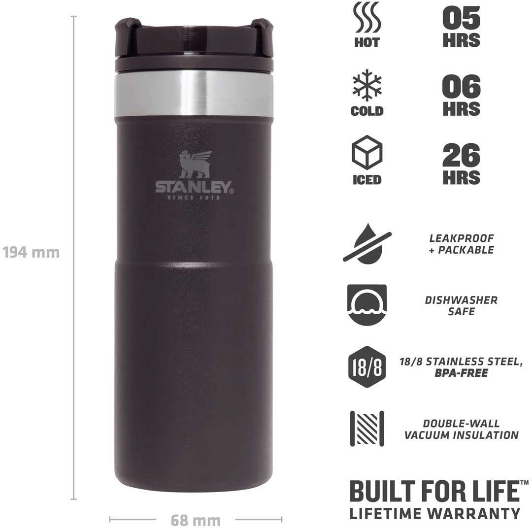 Mit dem Stanley NEVERLEAK TRAVEL MUG werden durch seine doppelwandige Edelstahl-Vakuumisolierung heiße Getränke bis zu 5 Stunden heiß und kalte Getränke bis zu 6 Stunden kalt gehalten. Der Trinkbecher aus rostfreiem 18/8-Edelstahl besitzt ein Fassungsvermögen von 354 ml und verfügt über einen einzigartigen 3-Positionen Deckel, der sich zum einfachen Trinken aufdrehen lässt und beim Schließen fest verriegelt. Der NEVERLEAK TRAVEL MUG ist komplett spülmaschinenfest, auslaufsicher und passt in gängige PKW-Getränkehalterungen. BPA-frei.
