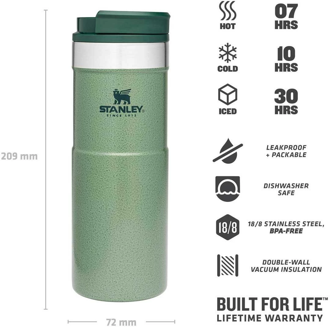 Mit dem Stanley NEVERLEAK TRAVEL MUG werden durch seine doppelwandige Edelstahl-Vakuumisolierung heiße Getränke bis zu 7 Stunden heiß und kalte Getränke bis zu 10 Stunden kalt gehalten. Der Trinkbecher aus rostfreiem 18/8-Edelstahl besitzt ein Fassungsvermögen von 473 ml und verfügt über einen einzigartigen 3-Positionen Deckel, der sich zum einfachen Trinken aufdrehen lässt und beim Schließen fest verriegelt. Der NEVERLEAK TRAVEL MUG ist komplett spülmaschinenfest, auslaufsicher und passt in gängige PKW-Getränkehalterungen. BPA-frei.