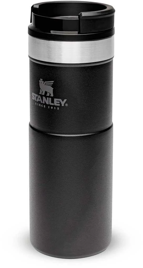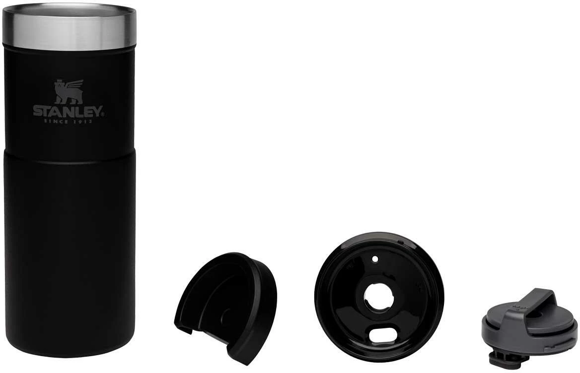 Mit dem Stanley NEVERLEAK TRAVEL MUG werden durch seine doppelwandige Edelstahl-Vakuumisolierung heiße Getränke bis zu 7 Stunden heiß und kalte Getränke bis zu 10 Stunden kalt gehalten. Der Trinkbecher aus rostfreiem 18/8-Edelstahl besitzt ein Fassungsvermögen von 473 ml und verfügt über einen einzigartigen 3-Positionen Deckel, der sich zum einfachen Trinken aufdrehen lässt und beim Schließen fest verriegelt. Der NEVERLEAK TRAVEL MUG ist komplett spülmaschinenfest, auslaufsicher und passt in gängige PKW-Getränkehalterungen. BPA-frei.